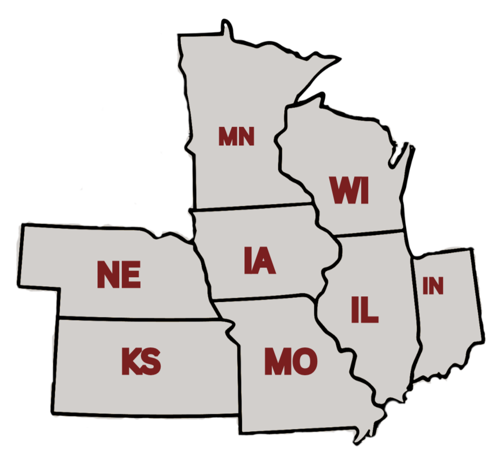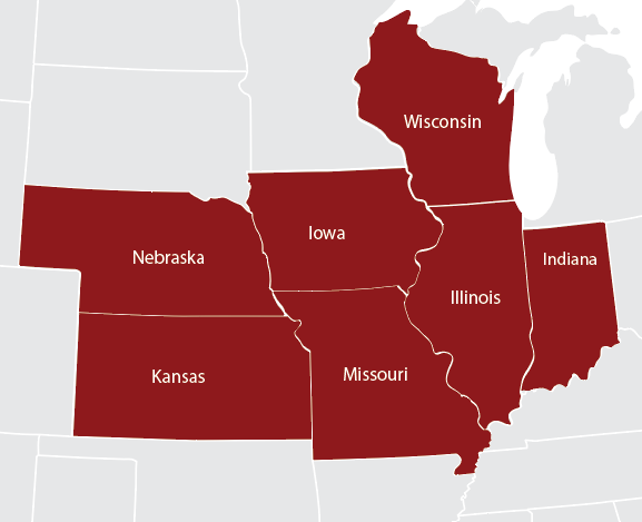 Illinois, NW Indiana, Iowa, Kansas, Minnesota, Missouri, Nebraska, and Wisconsin.